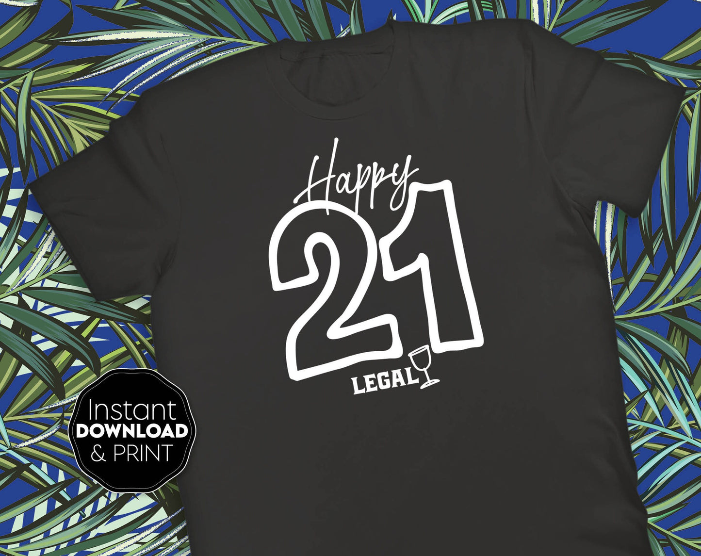 21st Birthday shirt design. Happy 21 Legal. SVG, PNG, EPS, DXF files included. Compatible with Cricut, Silhouette and others machines. Use for sublimation or laser cut projects as well. Buy now for a good - discount price. Enjoy!