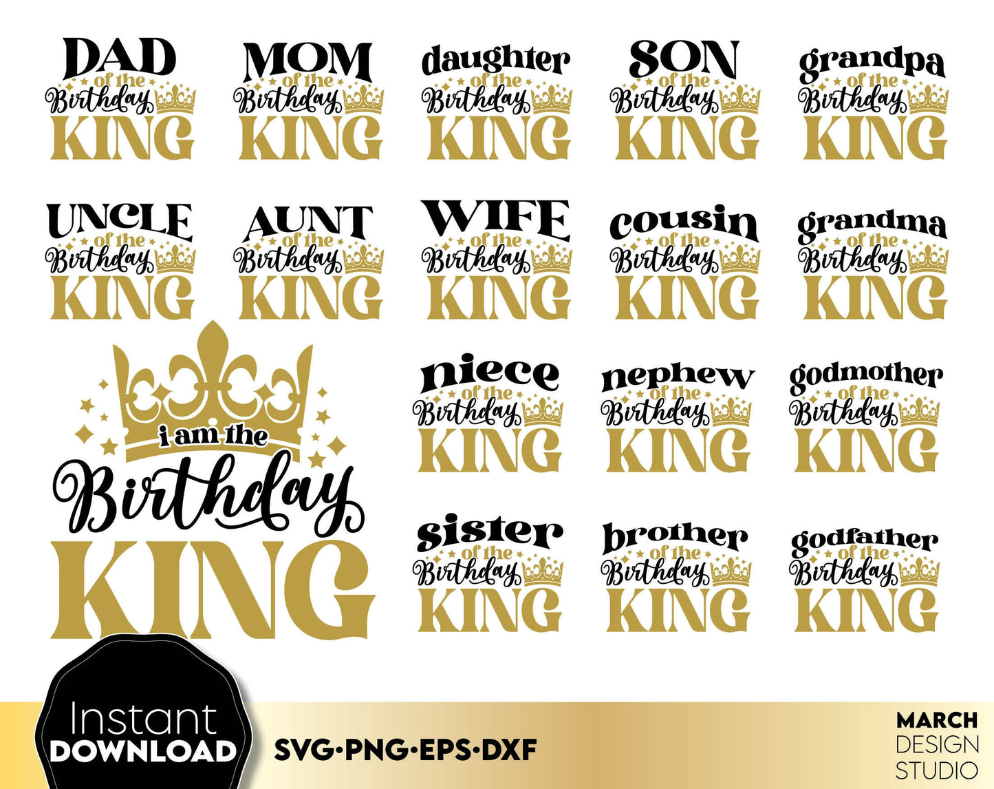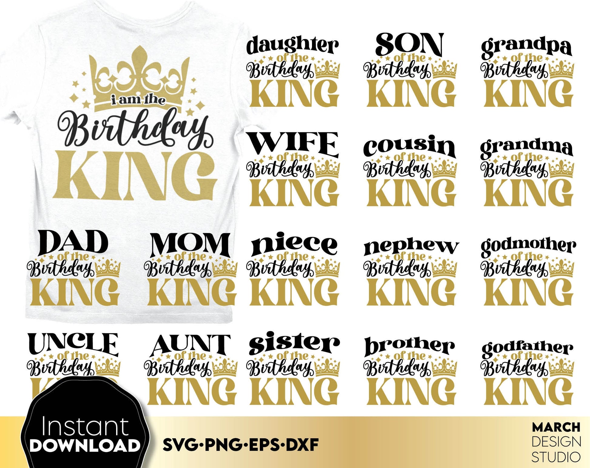 Birthday King Matching Family Shirts Designs. SVG PNG EPS DXF files included. Compatible with Cricut, Silhouette or other equipment. Cut from vinyl, use for sublimation or laser cut / grave projects as well. Buy now for a good price and enjoy!