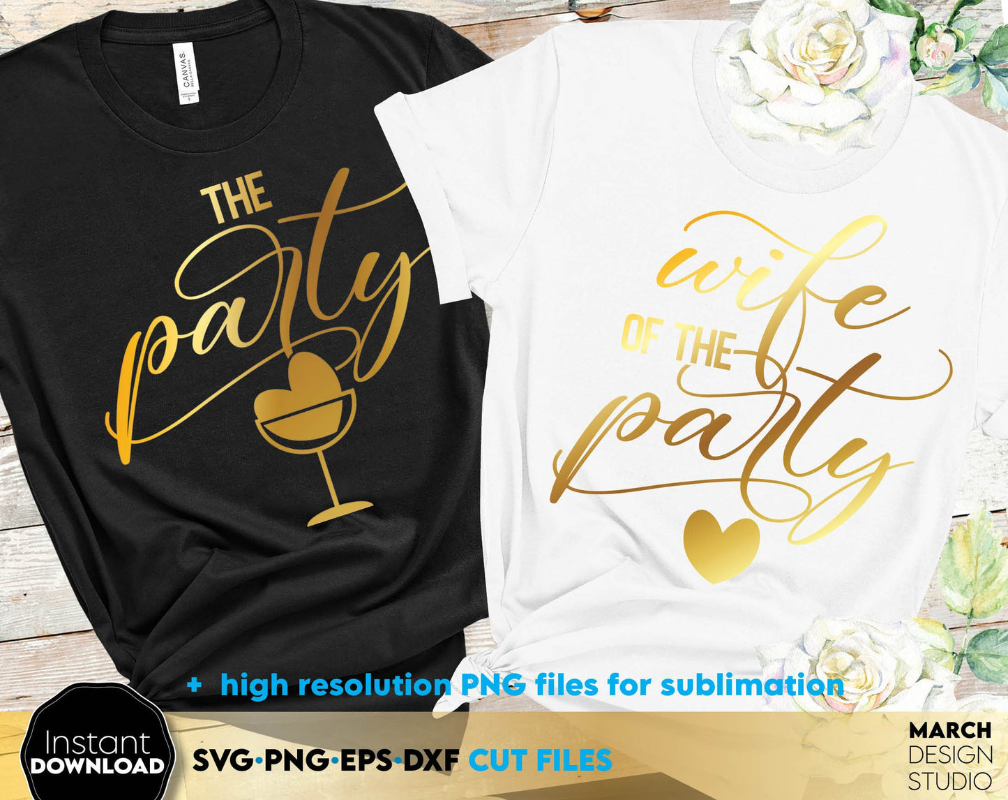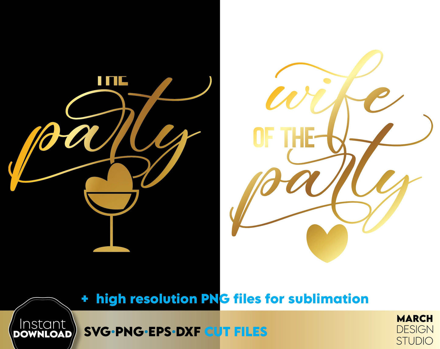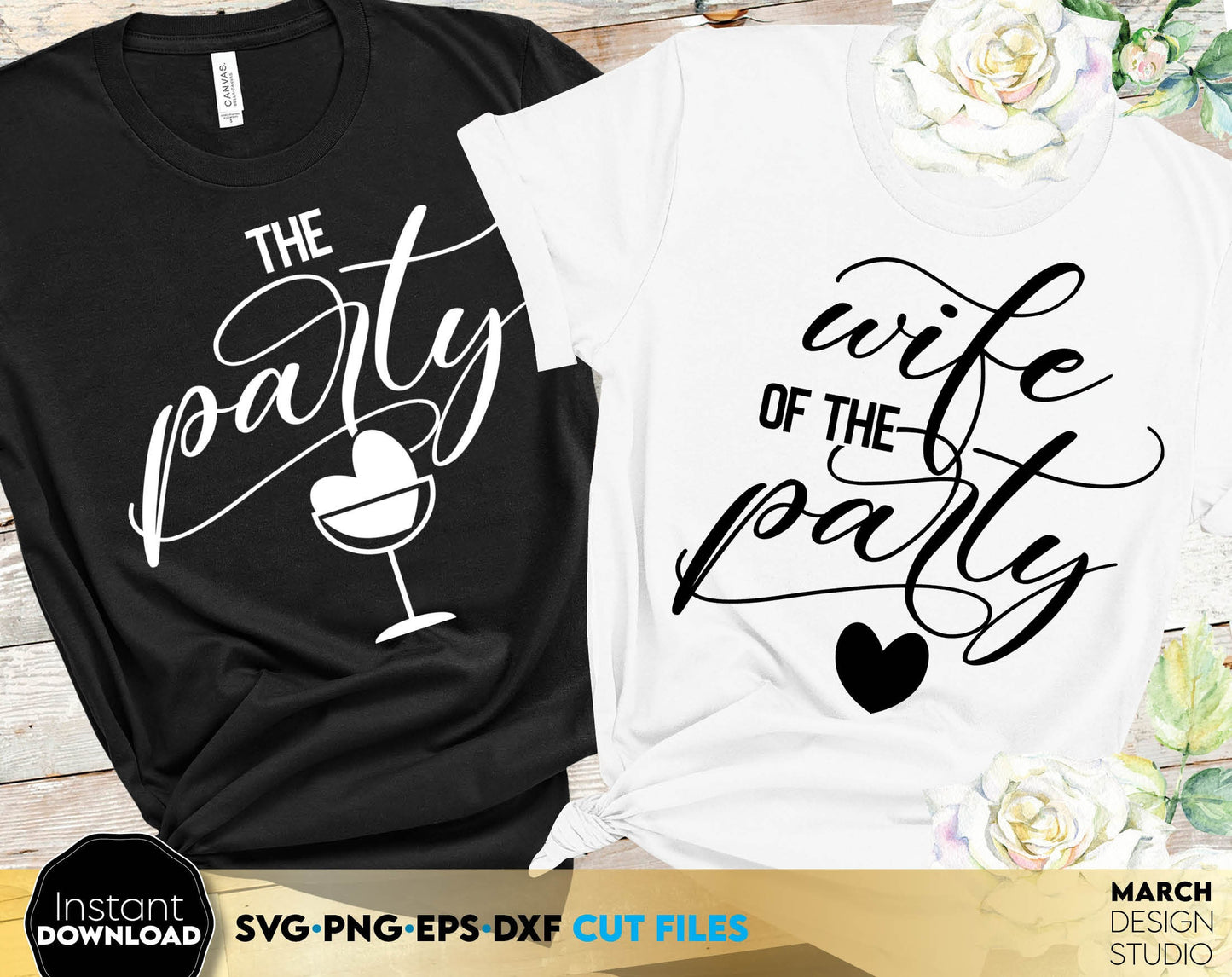 The party and wife of the party shirt designs. SVG PNG JPG EPS DXF files included. Compatible with Cricut, Silhouette or other equipment. Cut from vinyl, use for sublimation or laser cut or grave projects. Buy now for a good price and enjoy!