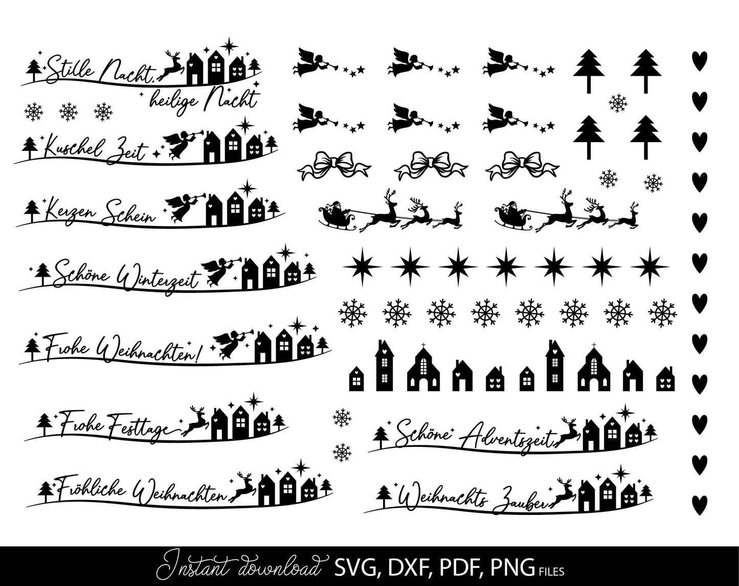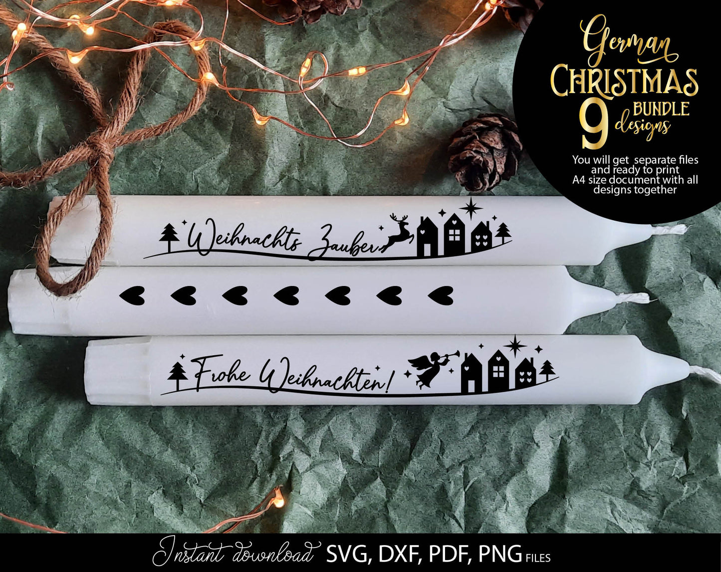 Bundle German Words Christmas SVG Plotter File Candle Texts Christmas Candle Design. Use with water slide paper. With Cricut, Silhouette or Glowforge as well. 22 German Christmas sayings included. SVG, DXF, EPS and PNG files included. Buy and enjoy!