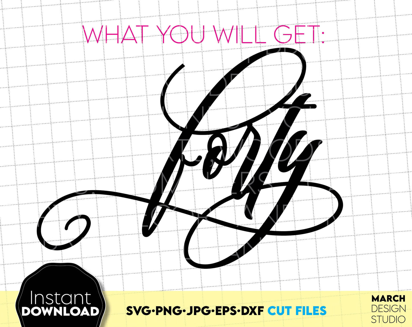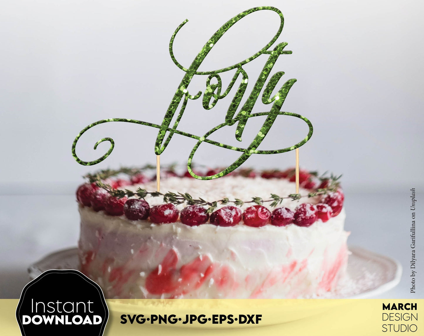Forty Birthday Cake topper for Your Birthday cake! SVG, PNG, JPG, EPS and DXF files included. Compatible with Cricut, Silhouette and others machines. Use for sublimation or laser cut projects as well. Buy now for a good - discount price. Enjoy!