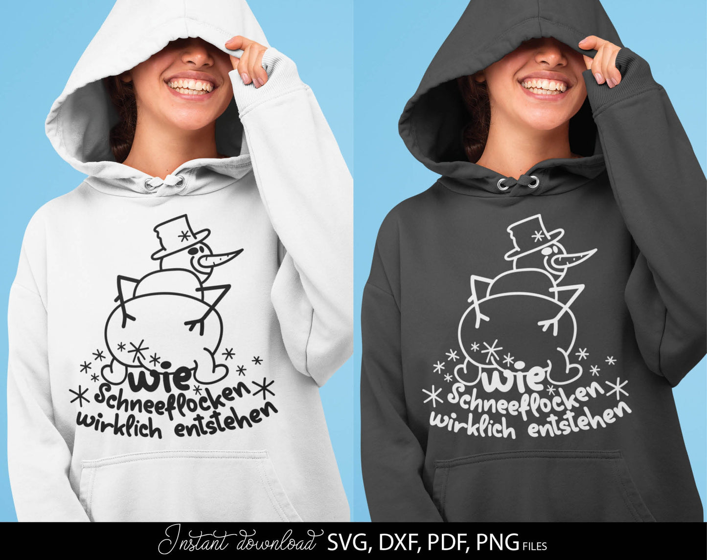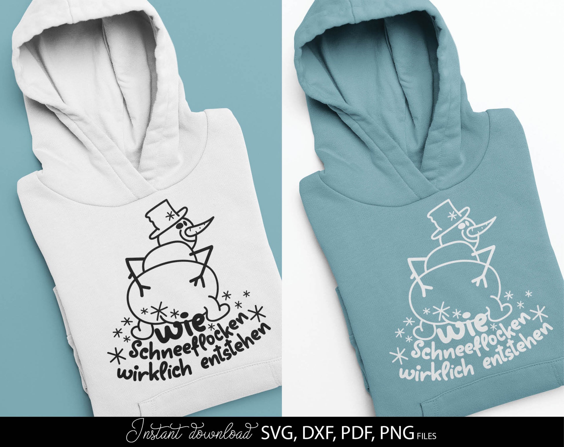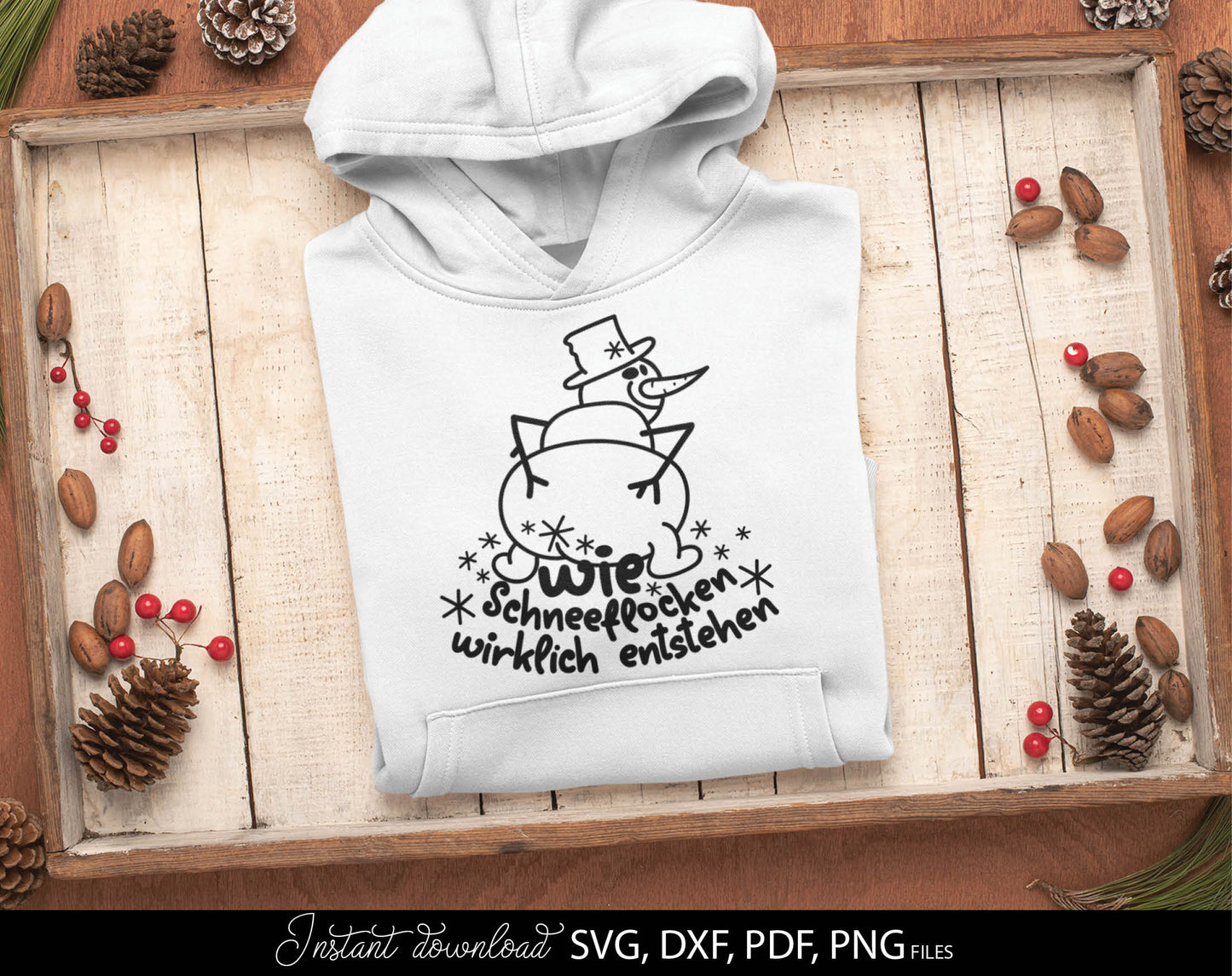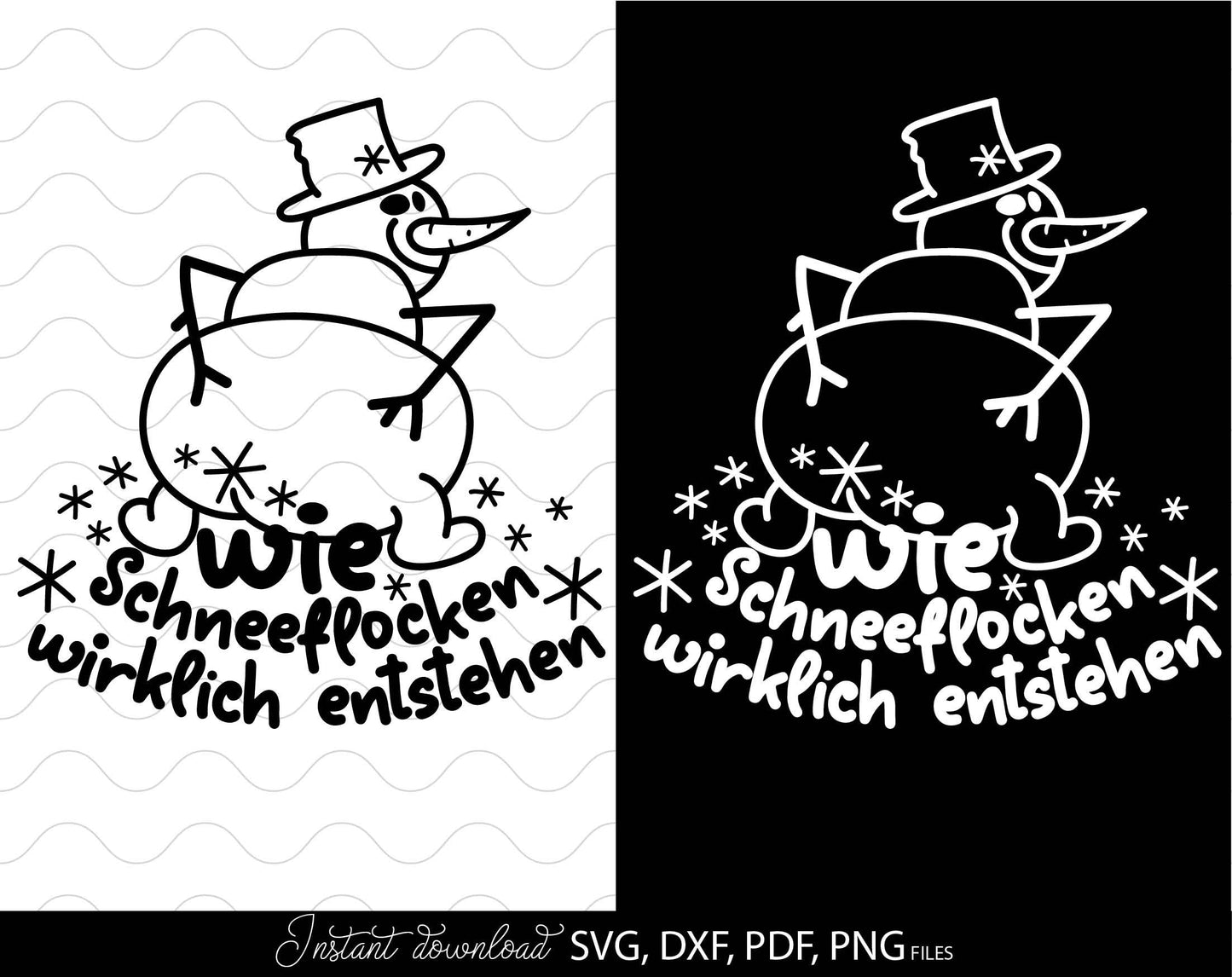 Lustiger Schneemann Plotter file with text in German language about How Snowflakes are really made. SVG DXF PDF PNG files included. Compatible with Cricut, Silhouette or other equipment. Cut from vinyl, use for sublimation or laser cut/ grave project as well. Bbuy now for a good price and enjoy!