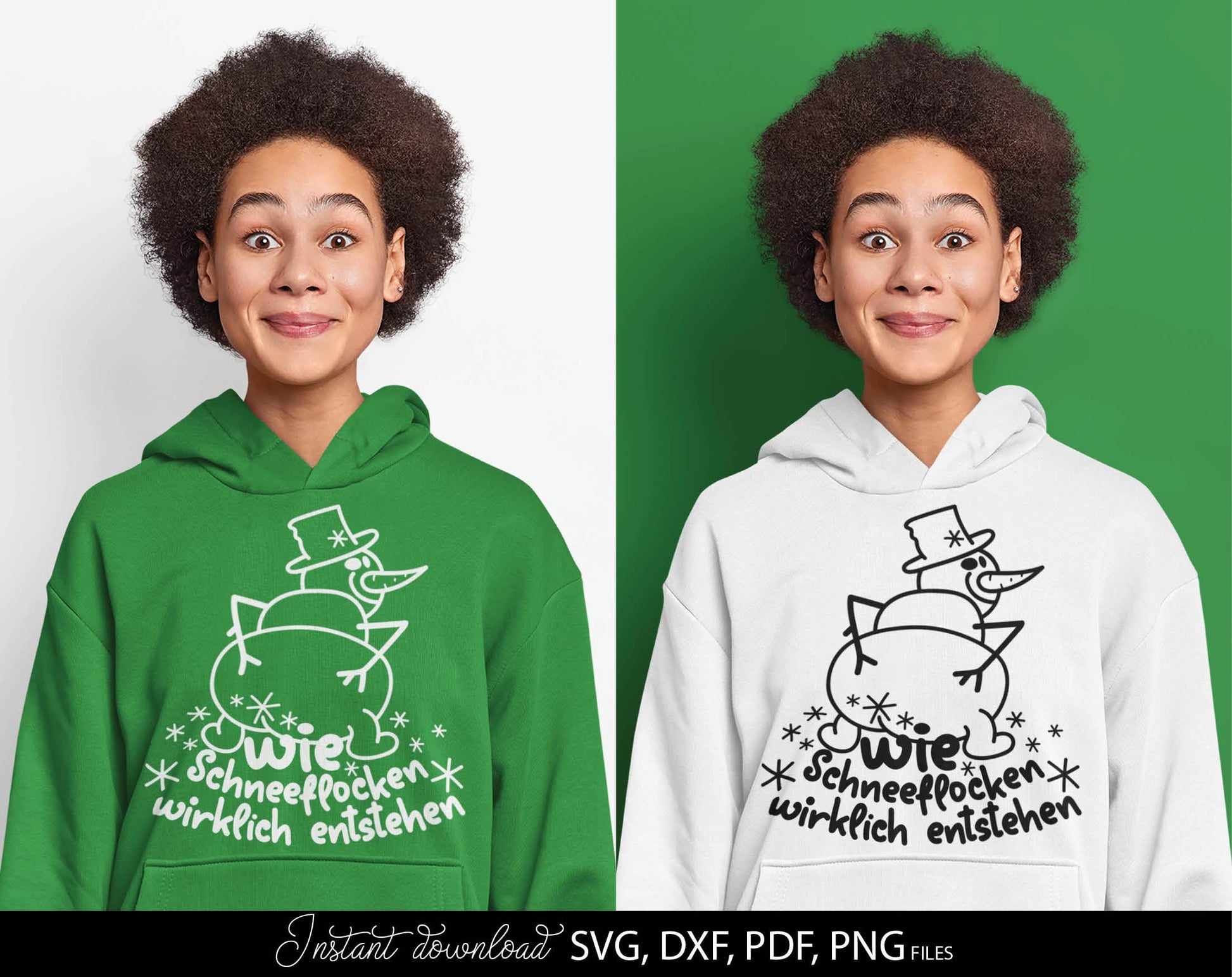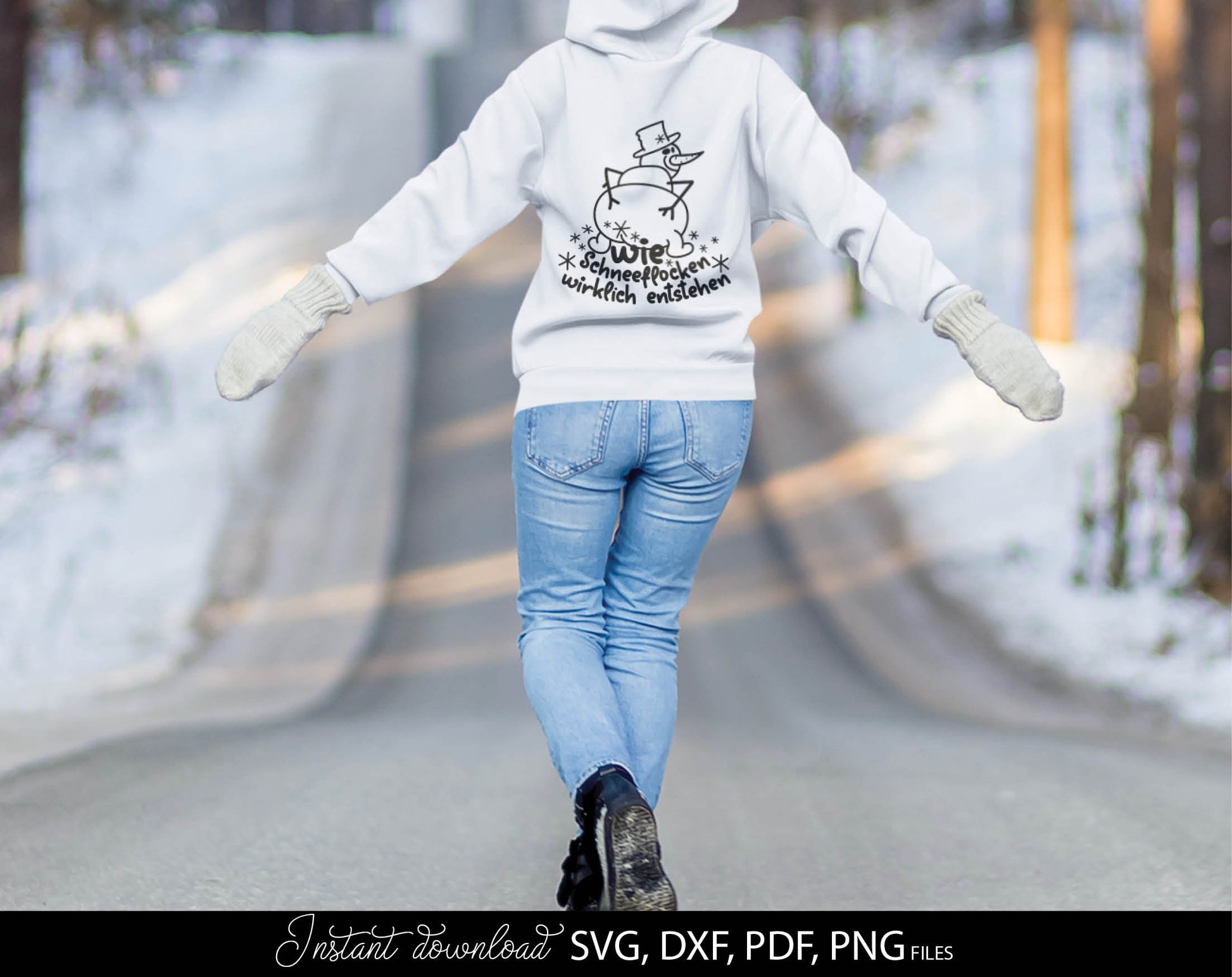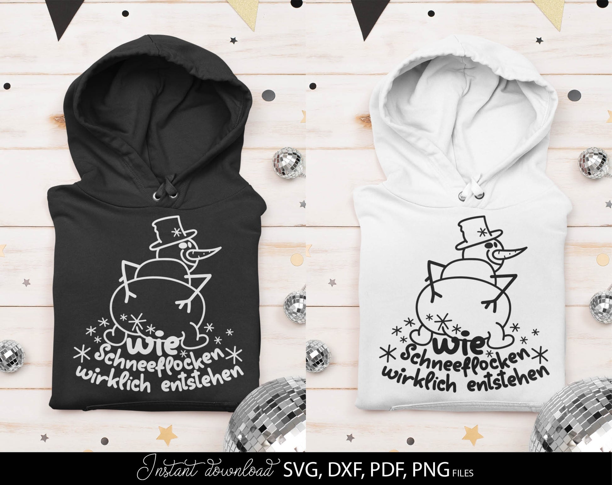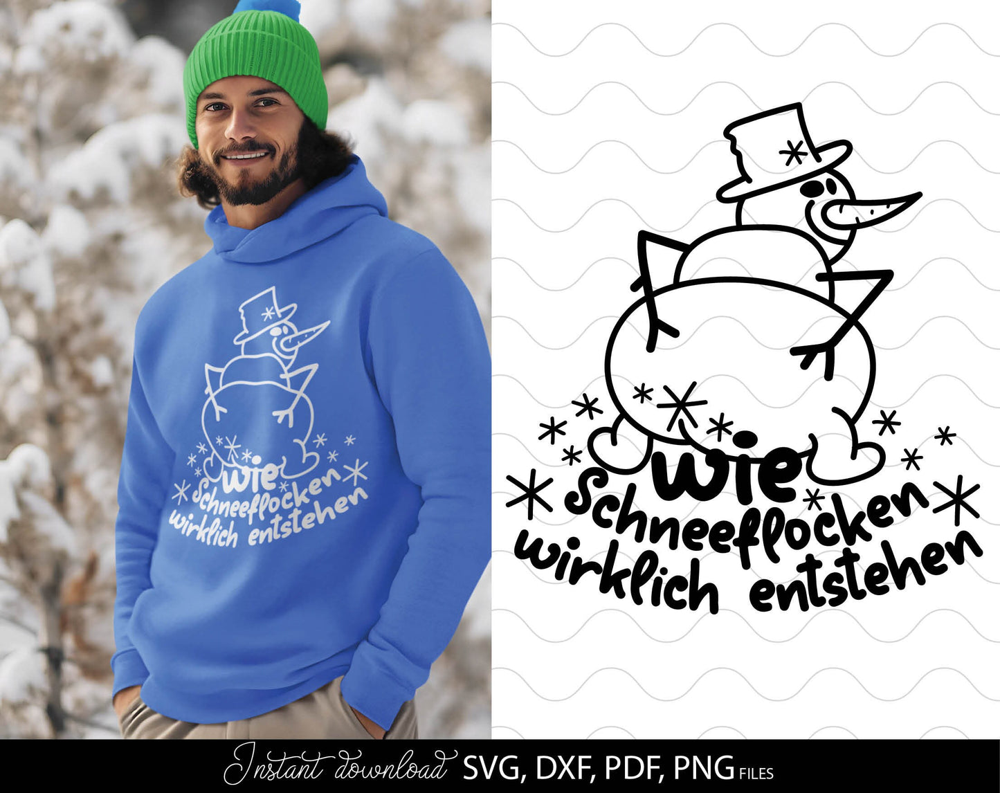 Lustiger Schneemann Plotter file with text in German language about How Snowflakes are really made. SVG DXF PDF PNG files included. Compatible with Cricut, Silhouette or other equipment. Cut from vinyl, use for sublimation or laser cut/ grave project as well. Bbuy now for a good price and enjoy!