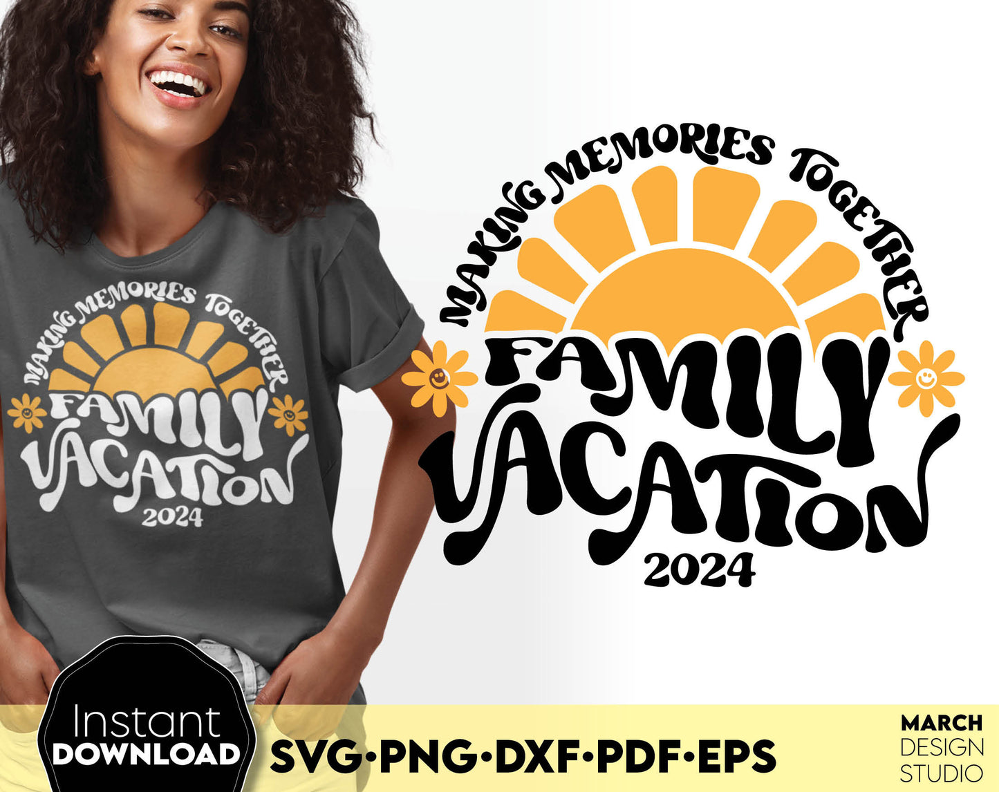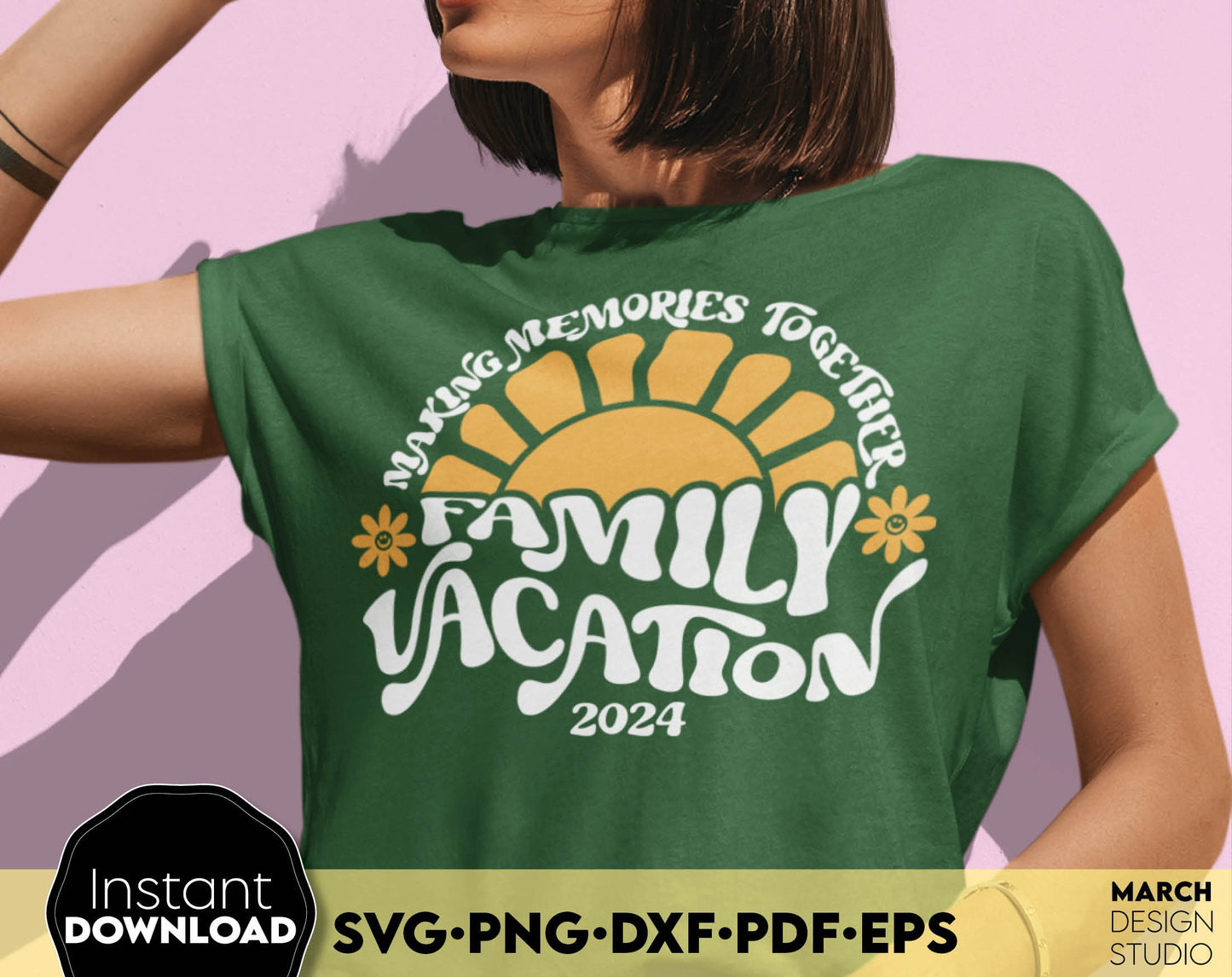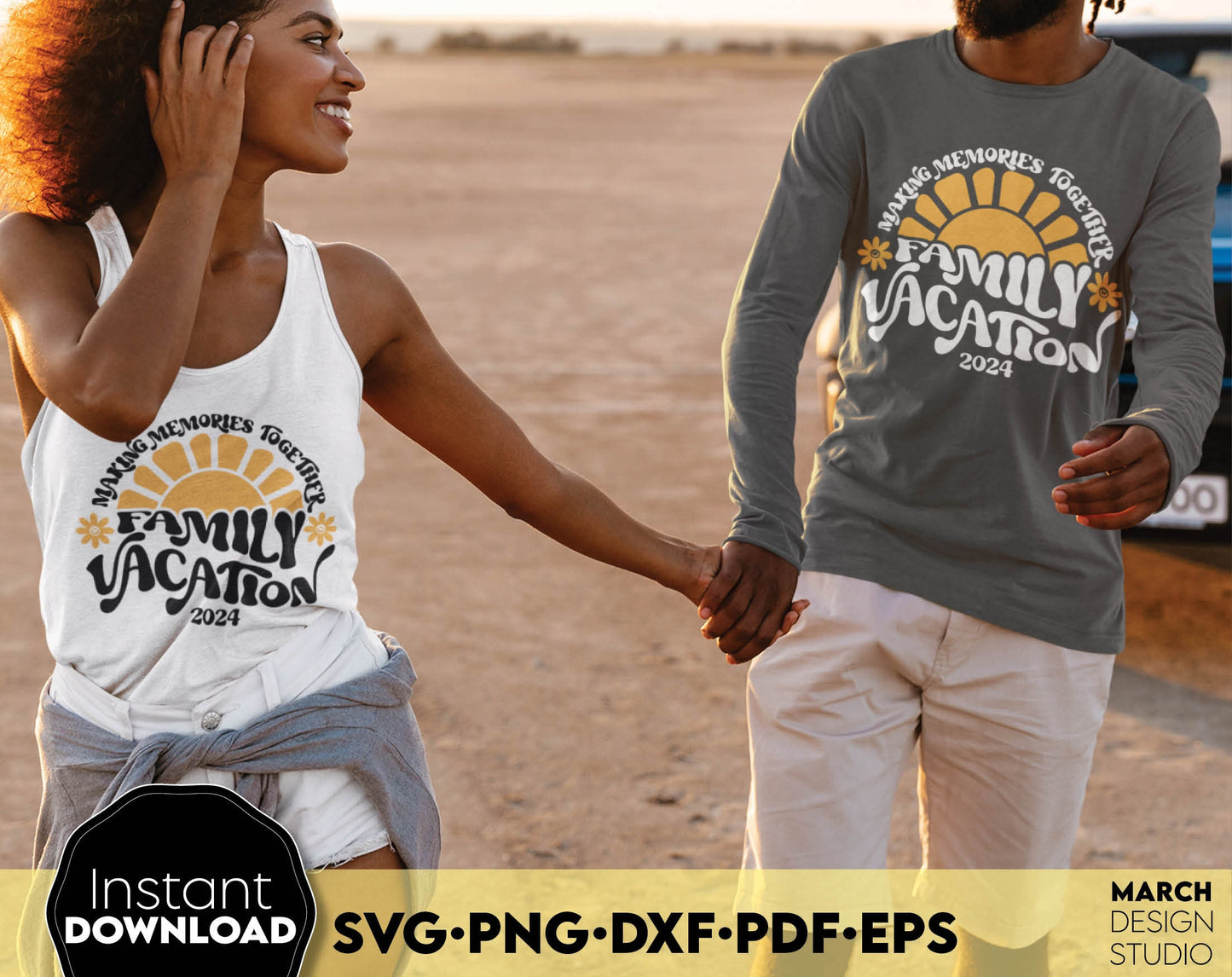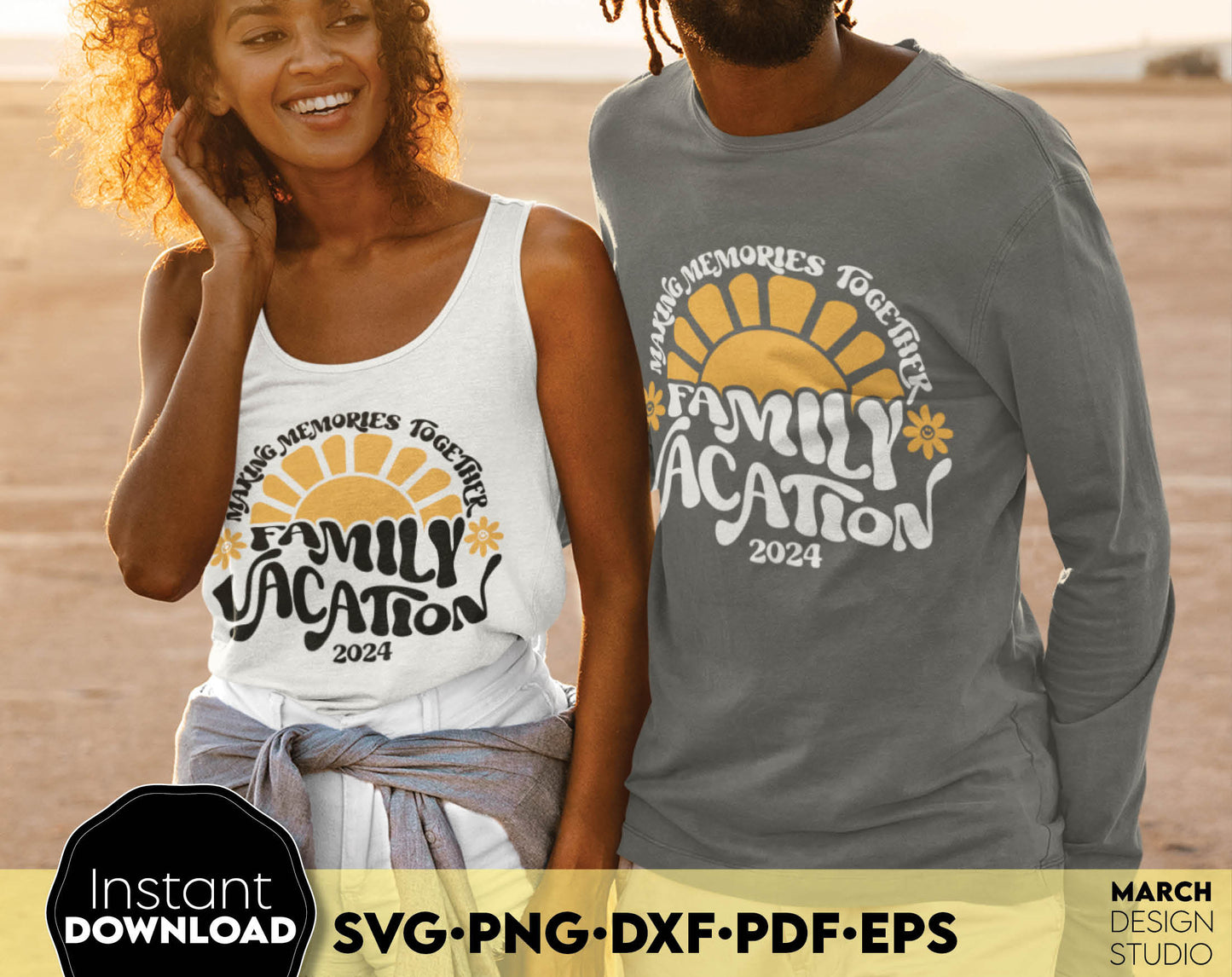 Making Memories together - Family Vacation 2025 shirts designs. Matching shirt design with sunrise and trendy font on it for Your summer vibes family weekend trips. SVG, PNG, EPS, JPG and DXF files included. Compatible with Cricut, Silhouette or other equipment. Buy now and enjoy!