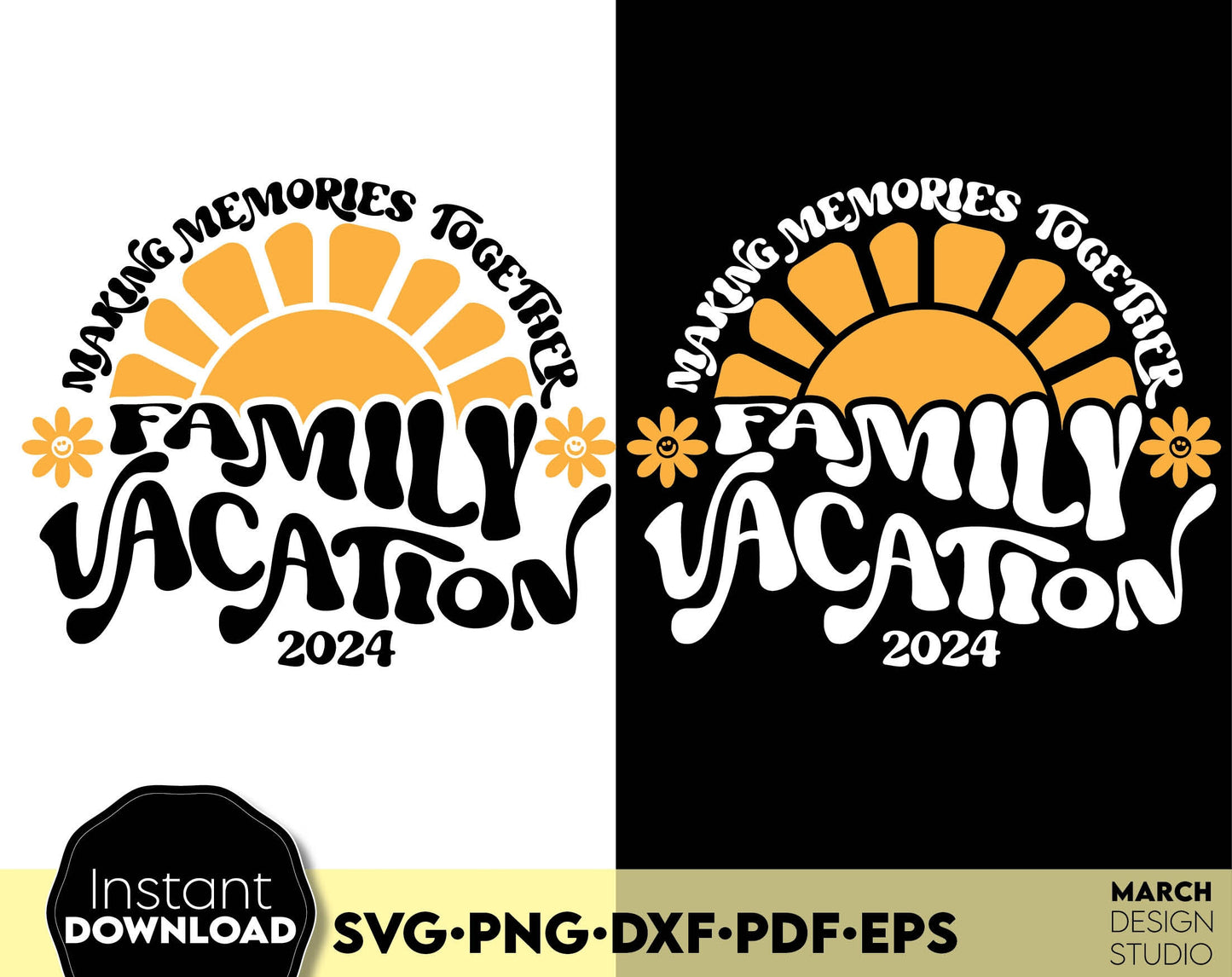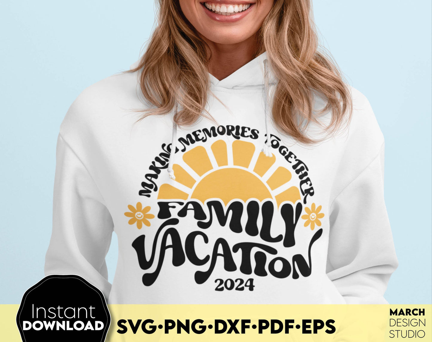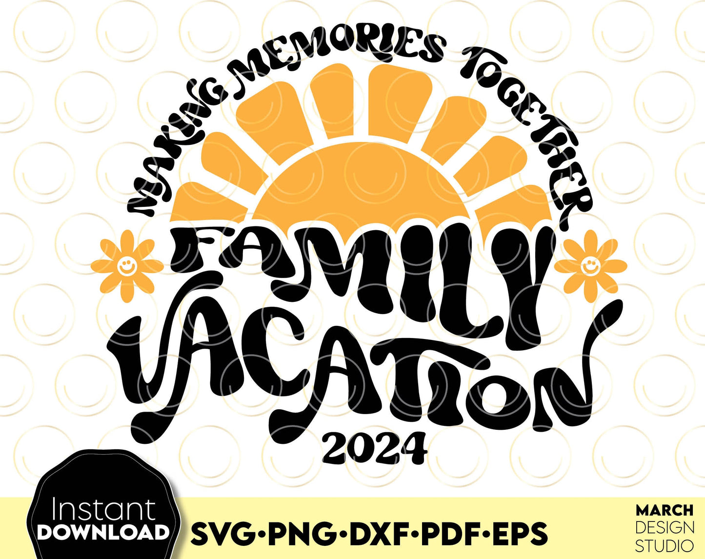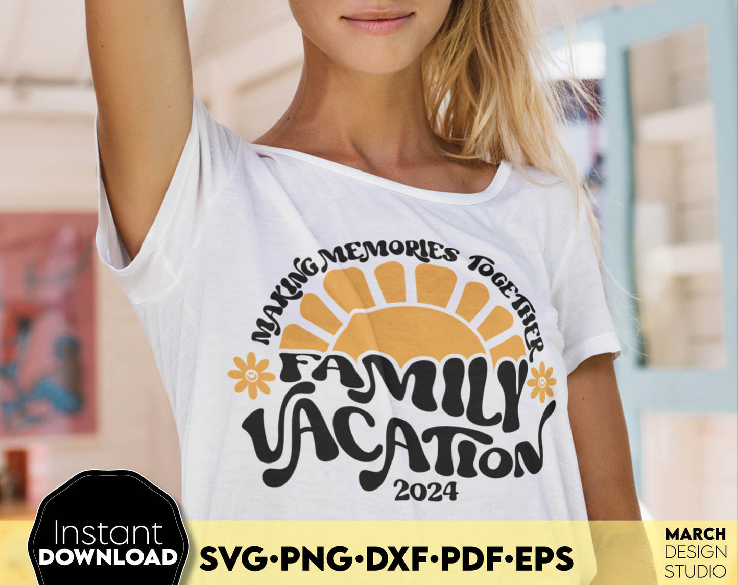 Making Memories together - Family Vacation 2025 shirts designs. Matching shirt design with sunrise and trendy font on it for Your summer vibes family weekend trips. SVG, PNG, EPS, JPG and DXF files included. Compatible with Cricut, Silhouette or other equipment. Buy now and enjoy!