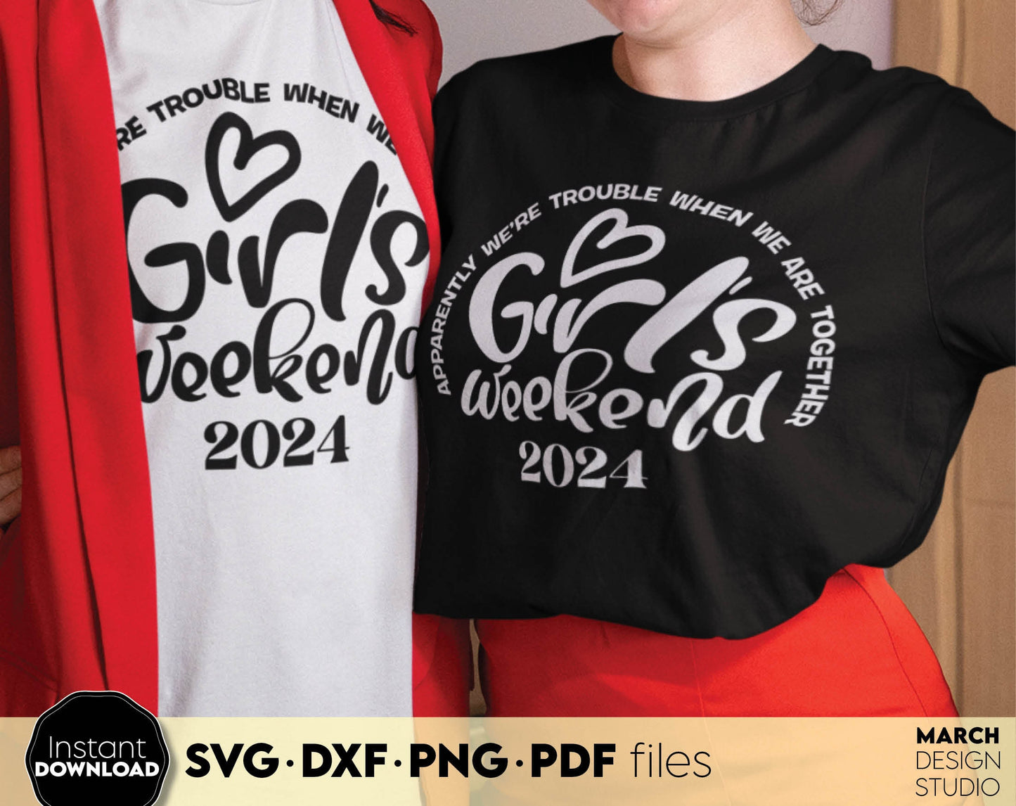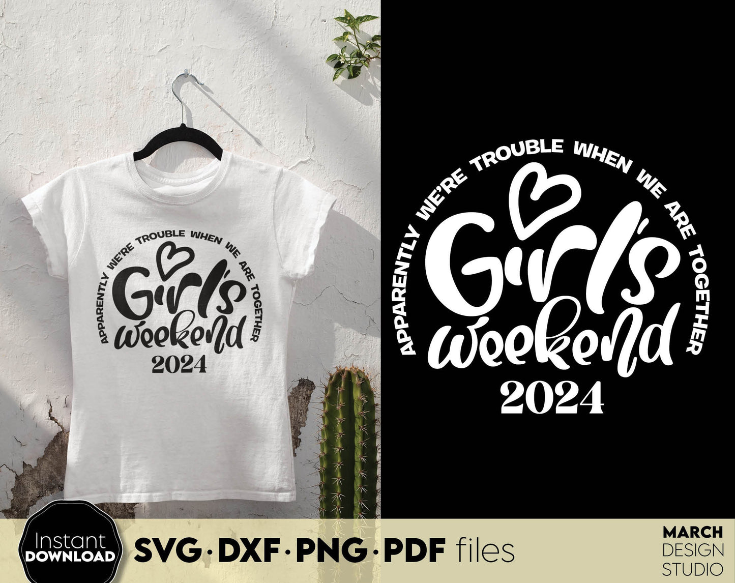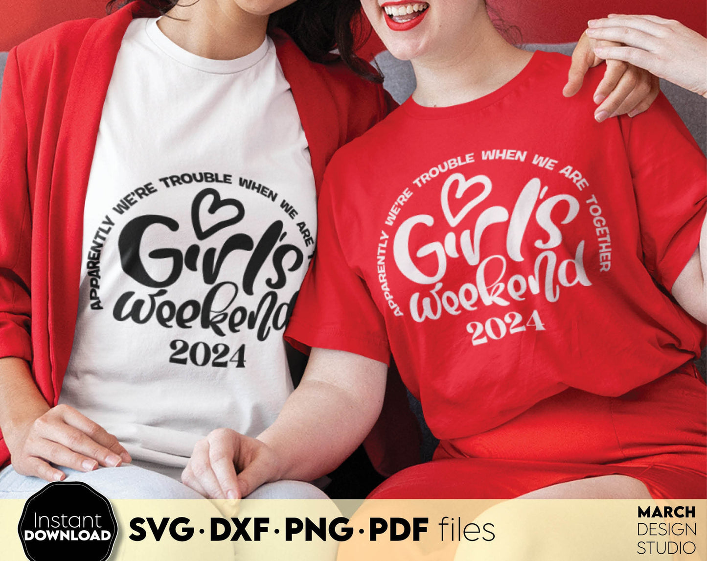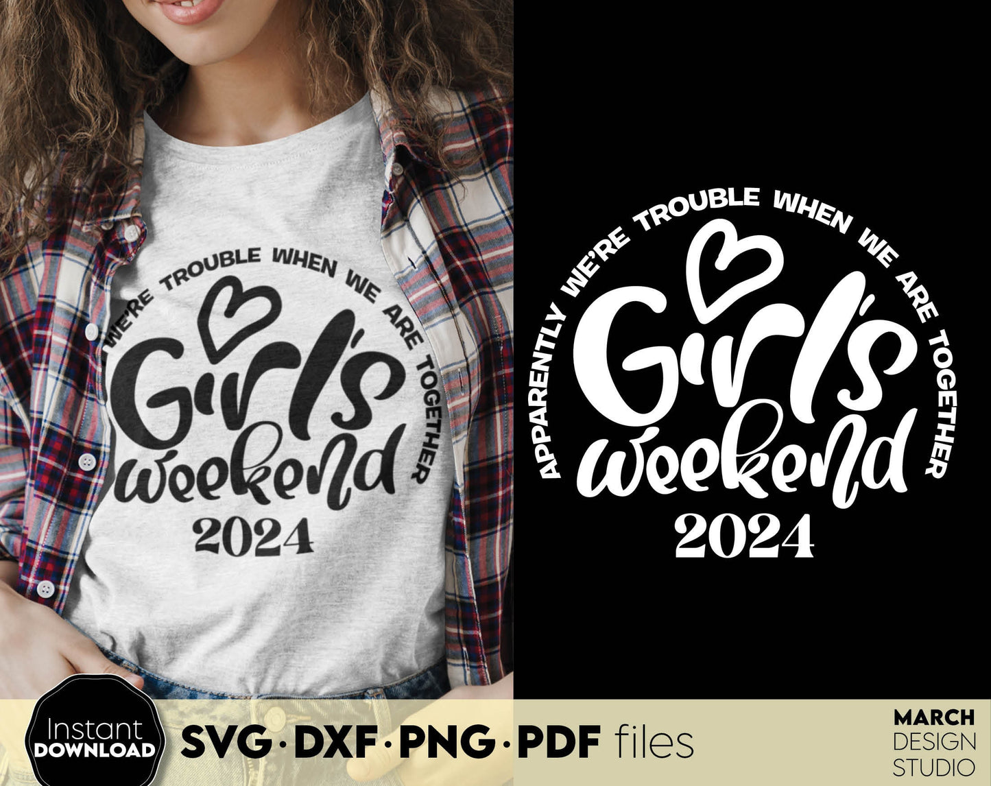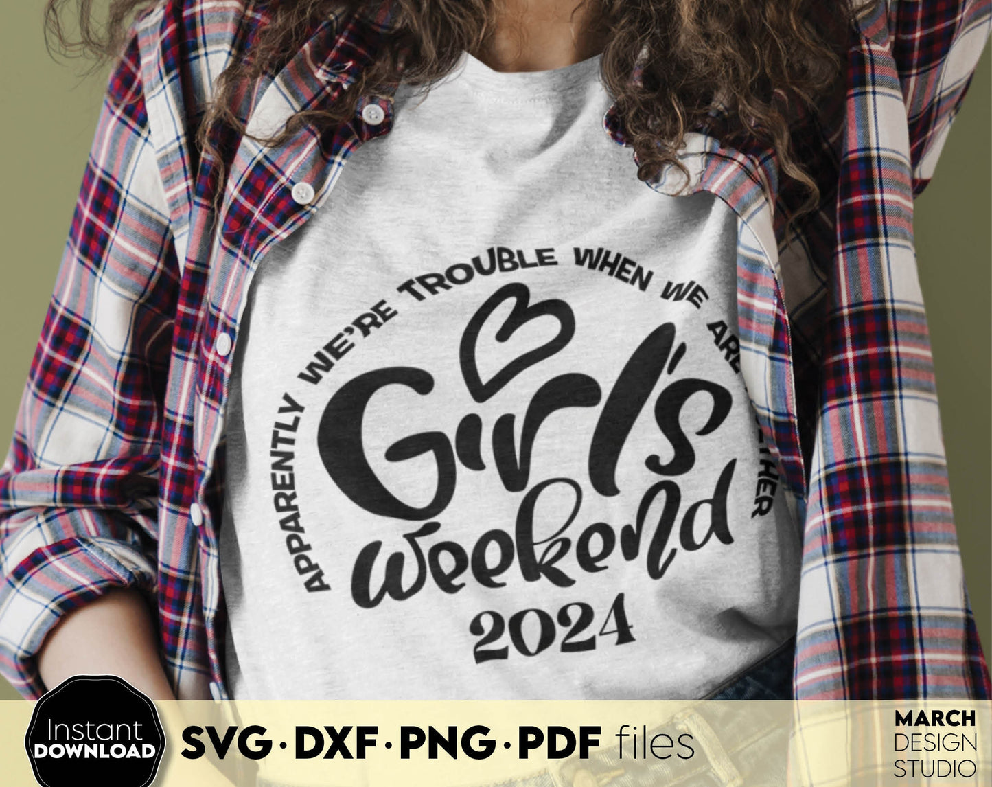 Apparently we are trouble when we are together - Girls Weekend 2024 matching trip shirts design. SVG DXF PNG PDF files included. Compatible with Cricut, Silhouette or other equipment. Cut from vinyl, use for sublimation or laser cut and grave project