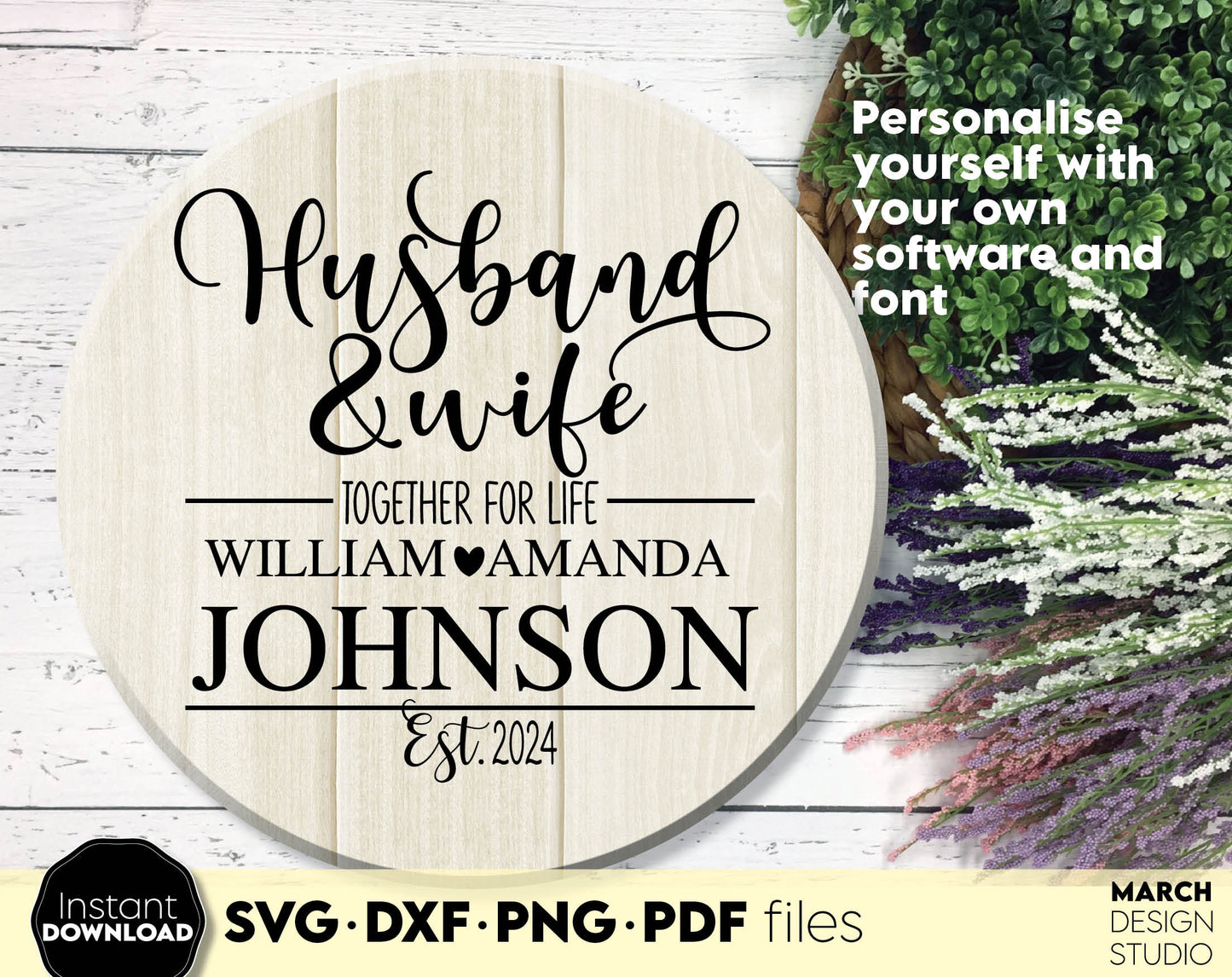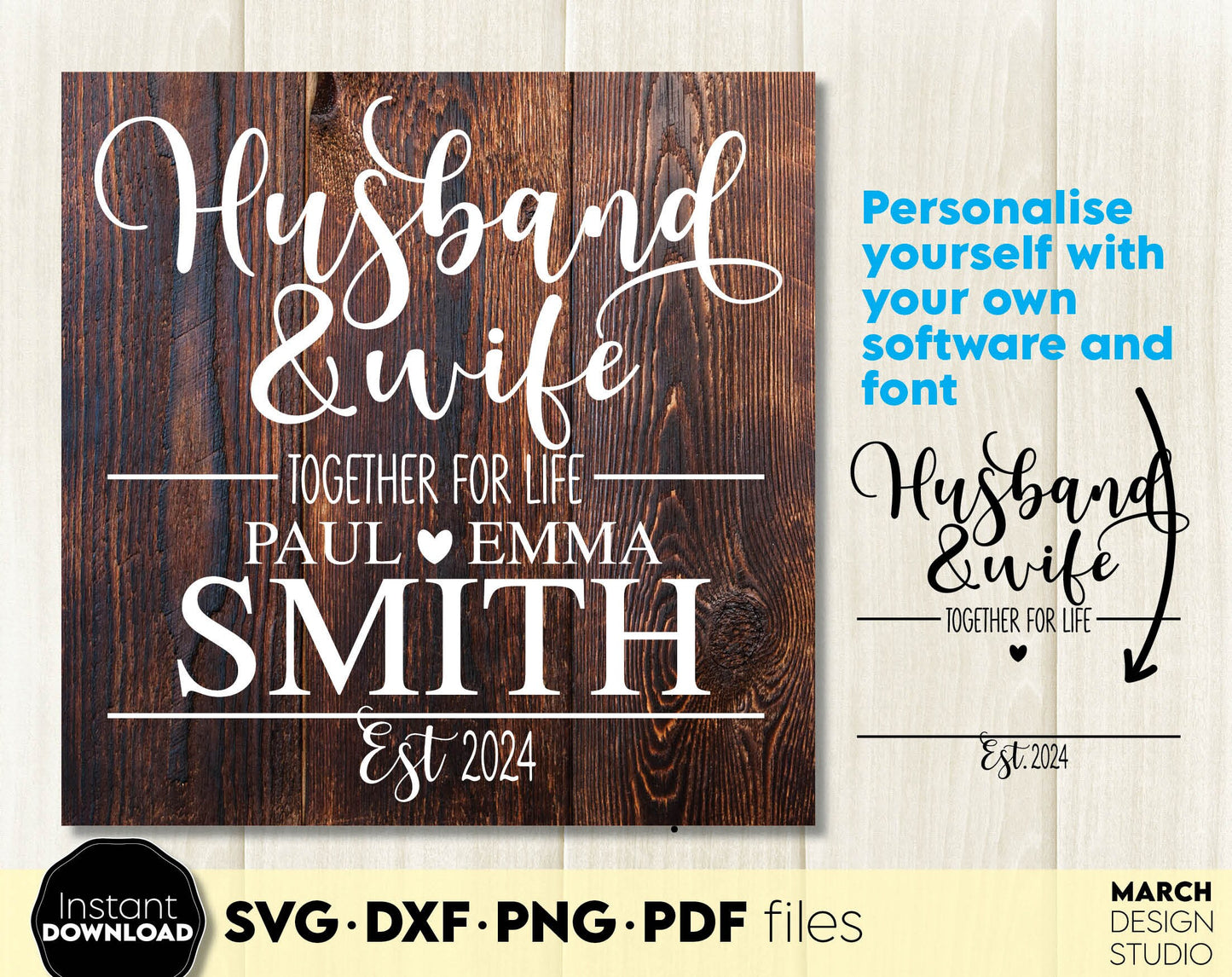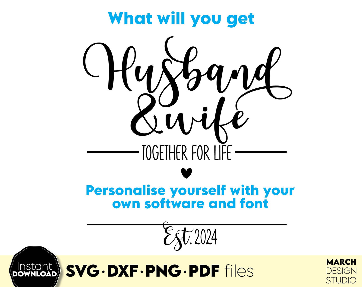 Husband and wife together for life design for wedding gift ideas. SVG DXF PNG PDF files included. Compatible with Cricut, Silhouette or sublimation printers. Cut from vinyl, use for sublimation or laser cut / grave projects as well. Buy now!