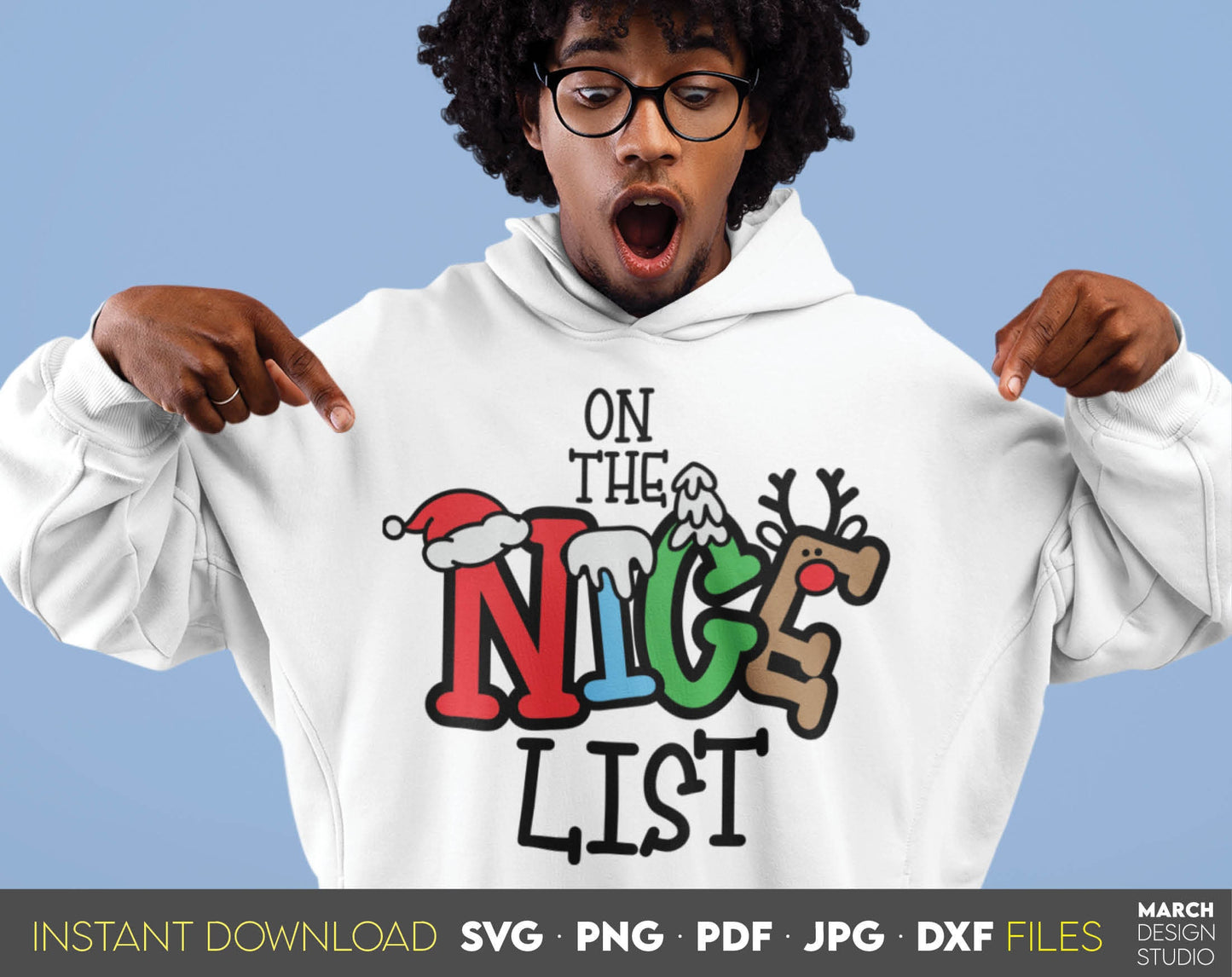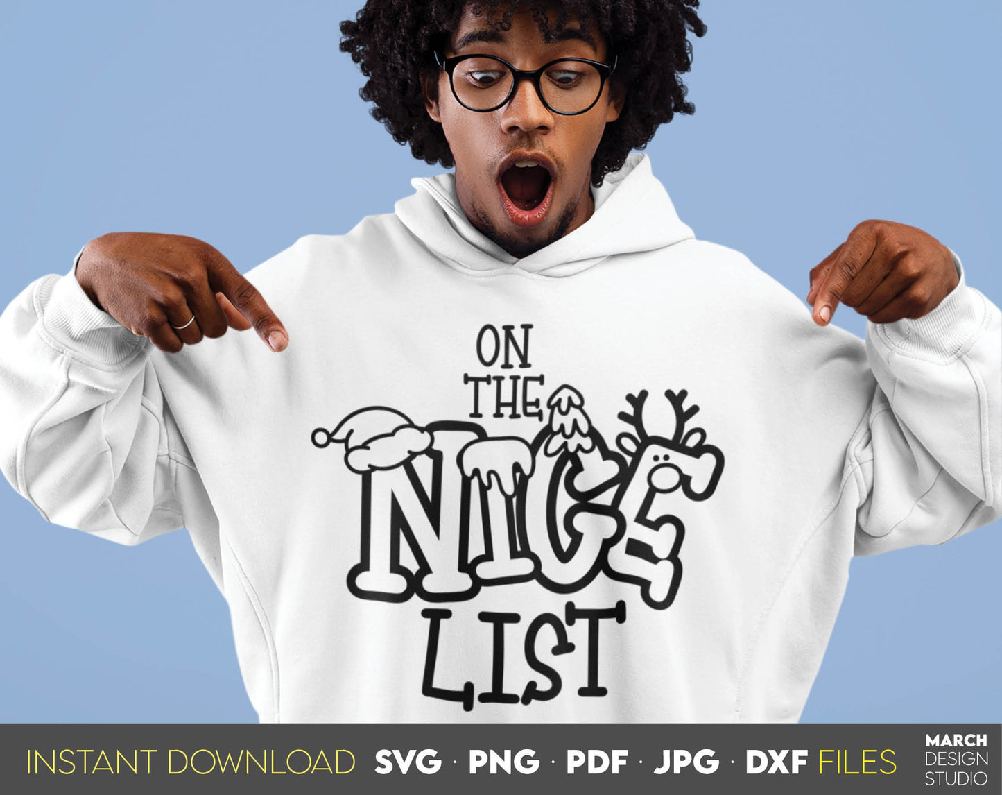 On the Nice List doodle letters Christmas Saying. Use for cutting form vinyl, sublimation or laser cut projects. SVG, PNG, DXF, PDF and JPG files included. Compatible with Cricut, Silhouette, Glowforge and other equipment. Buy now and enjoy!