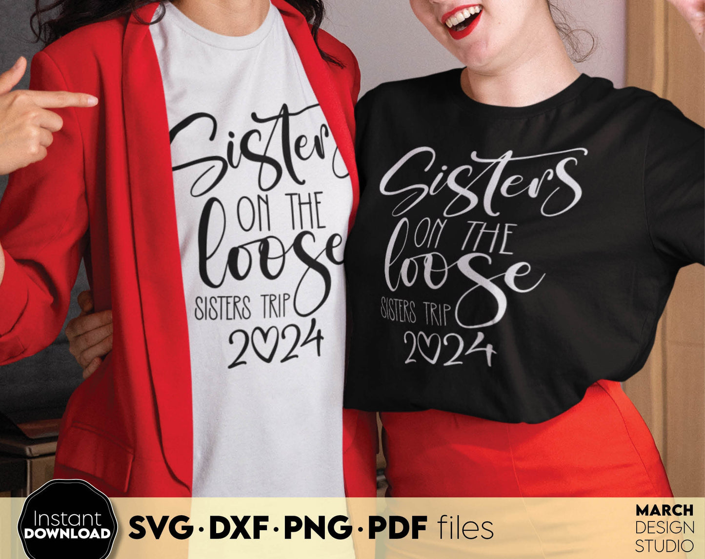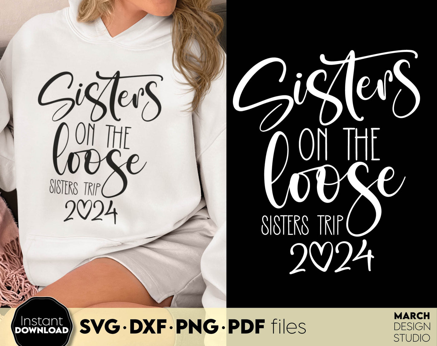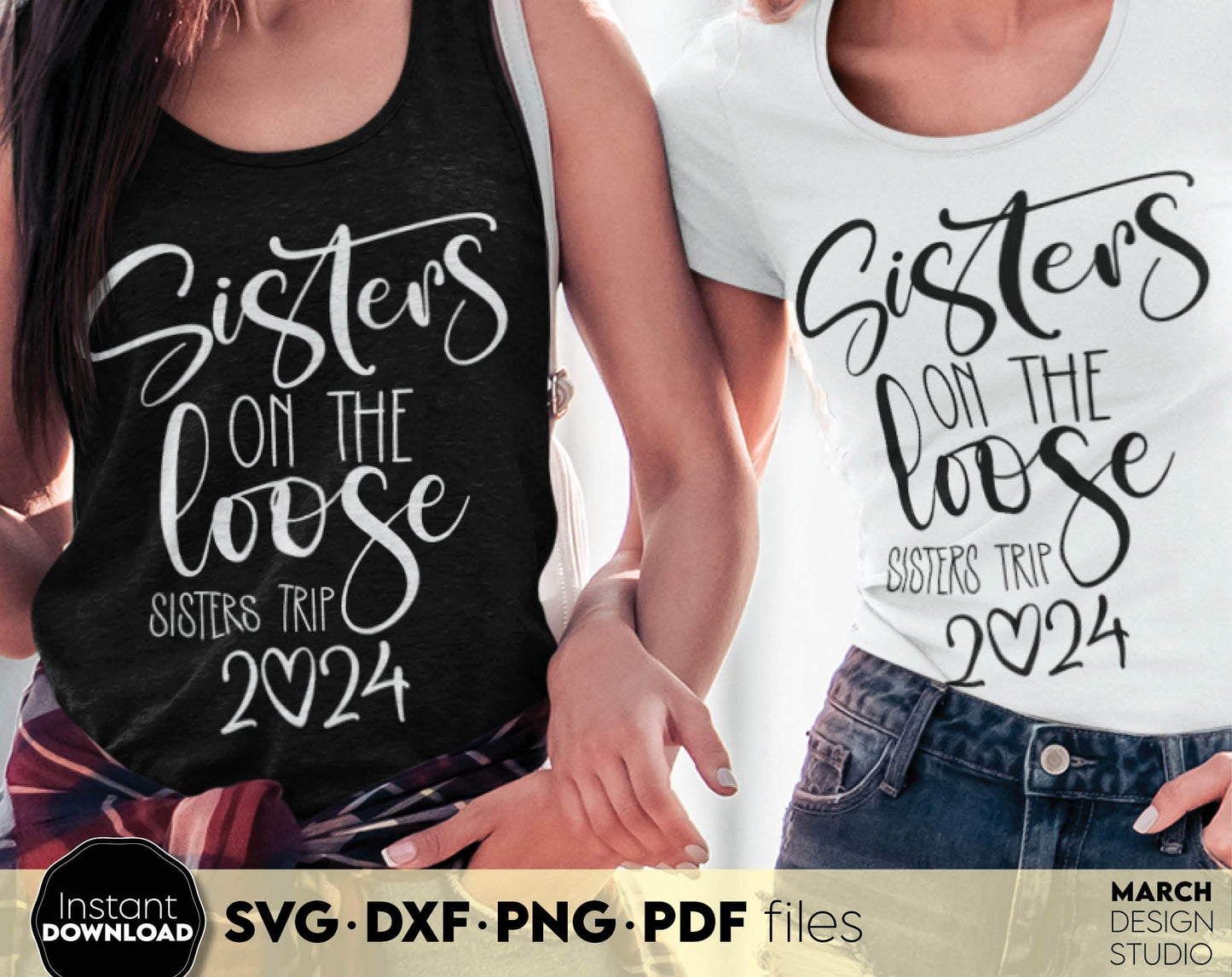 Sisters on the loose sisters trip 2024. Your girls summer trip matching shirts design. SVG DXF PNG PDF files included. Compatible with Cricut, Silhouette or sublimation printers. Cut from vinyl, use for sublimation or laser projects. Buy now and fun!
