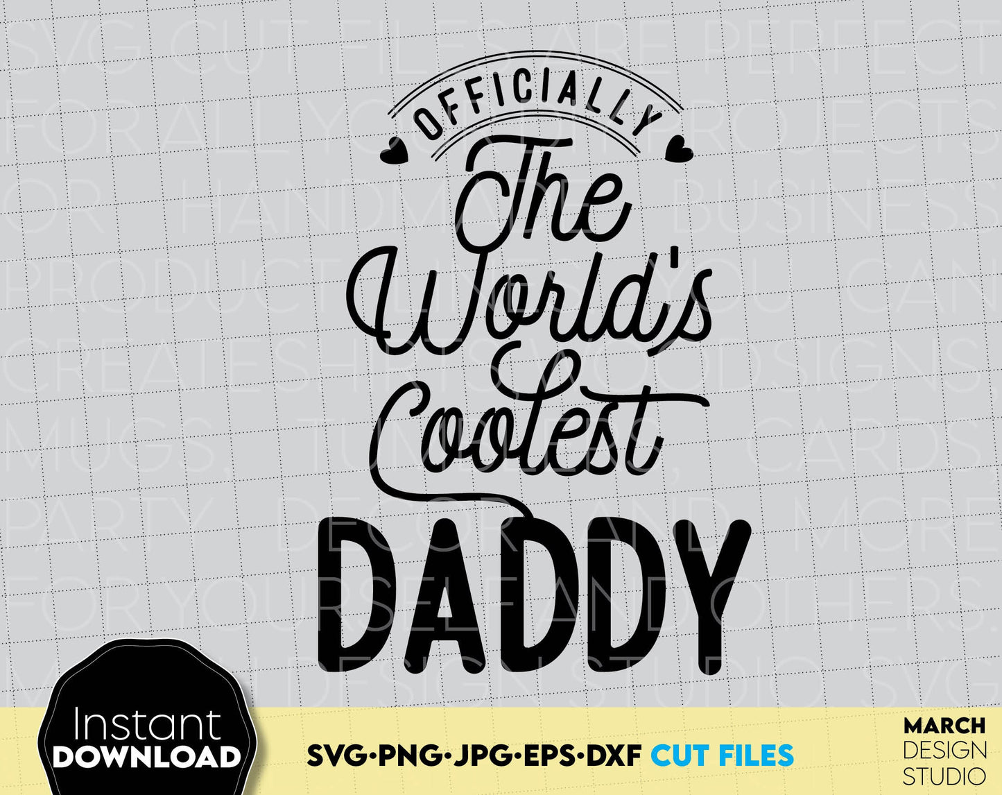 The Worlds Coolest Daddy - Instant Download Design for Your Fathers Day Gifts. Create a personalized gift for your World's Best Dad Ever. The gift for Father's Day is here. Use the available SVG, DXF, EPS, PNG or JPG files to make a unique shirt, cup, tumbler or anything else for your best dad. The files are compatible with Cricut, Glowforge, and Silhouette, as well as other popular personalized gift-making machines.