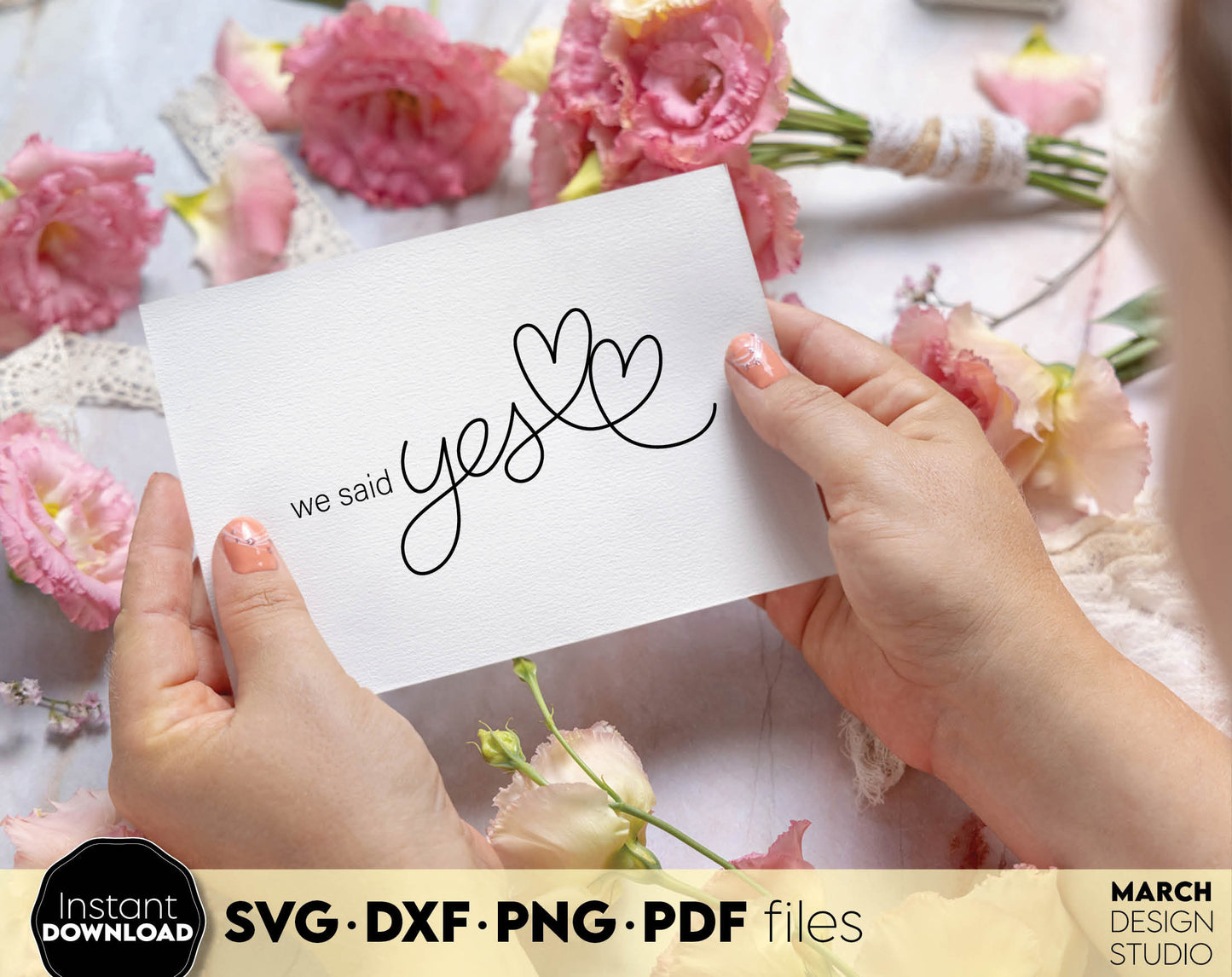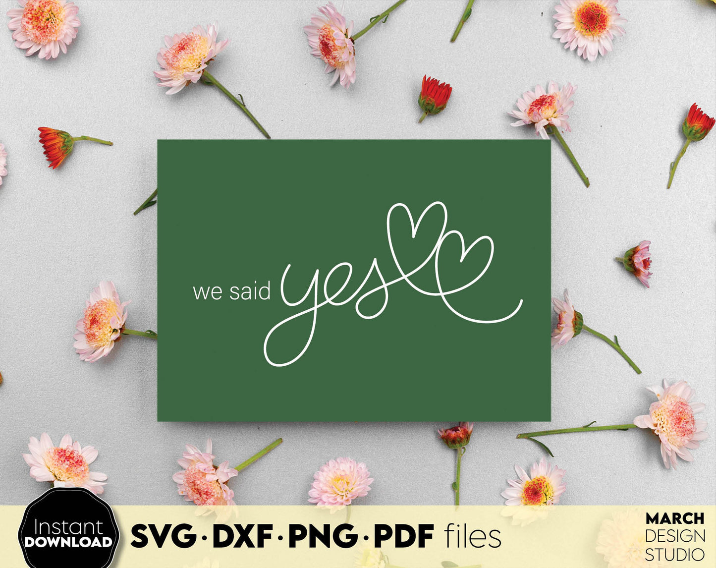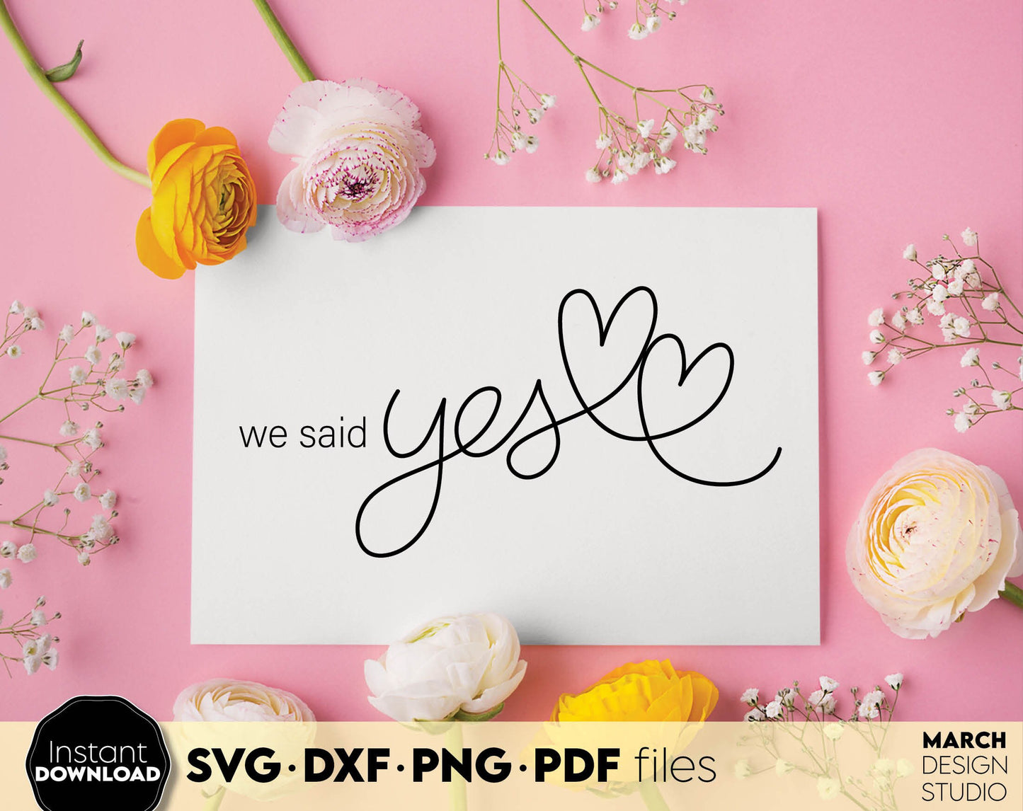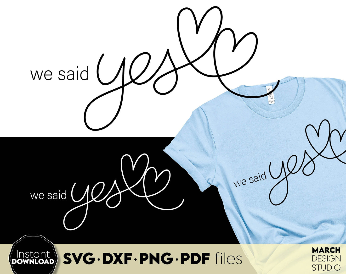 We Said Yes design for shirts, cards, wedding party decal. SVG DXF PNG PDF files included. Compatible with Cricut, Silhouette or sublimation printers. Cut from vinyl, use for sublimation or laser cut projects. Buy now for a good price and enjoy!
