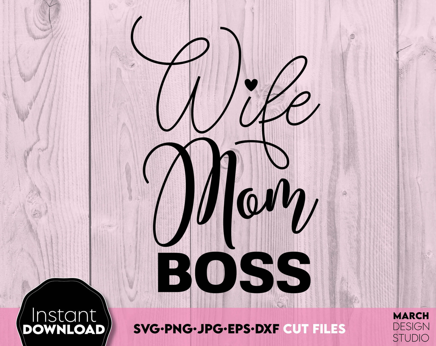 Wife Mom Boss design for best mom ever birthday or Mother`s day projects. Use for cutting form vinyl, sublimation or laser cut projects. SVG, PNG, DXF, EPS files included. Compatible with Cricut, Silhouette, Glowforge and other equipment. Buy now and enjoy!